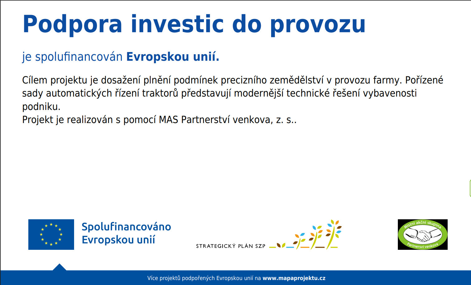 VOS zemědělců, a. s. Velké Opatovice za podpory MAS Partnerství venkova, z. s., Intervence 52.77 LEADER – Fiche 4 pořídila 3ks sad automatického navádění traktorů. VOS zemědělců, a. s. tímto děkuje MAS Partnerství venkova, z.s. za odborné vedení a pomoc při přípravě a realizaci projektu.
